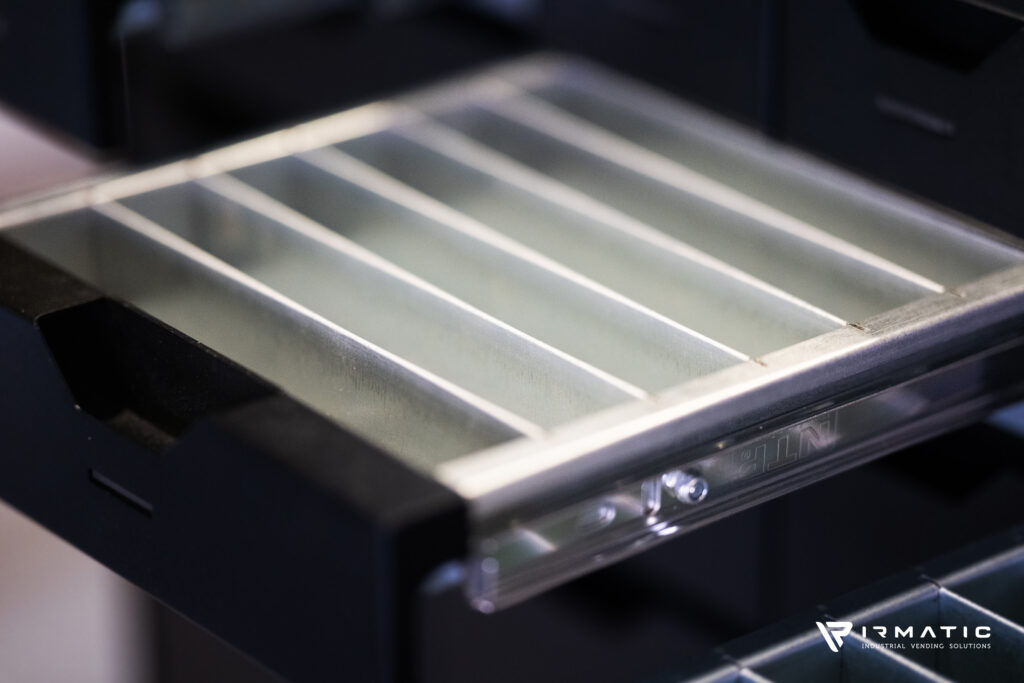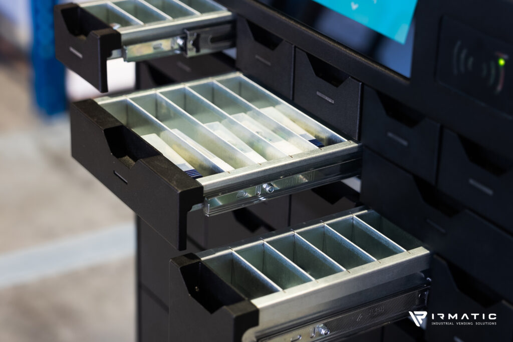 The modular design allows configuration of up to 120 independent dispensing drawers with 31 types of layouts. It supports products of various sizes and values – from PPE inserts to precision tools.