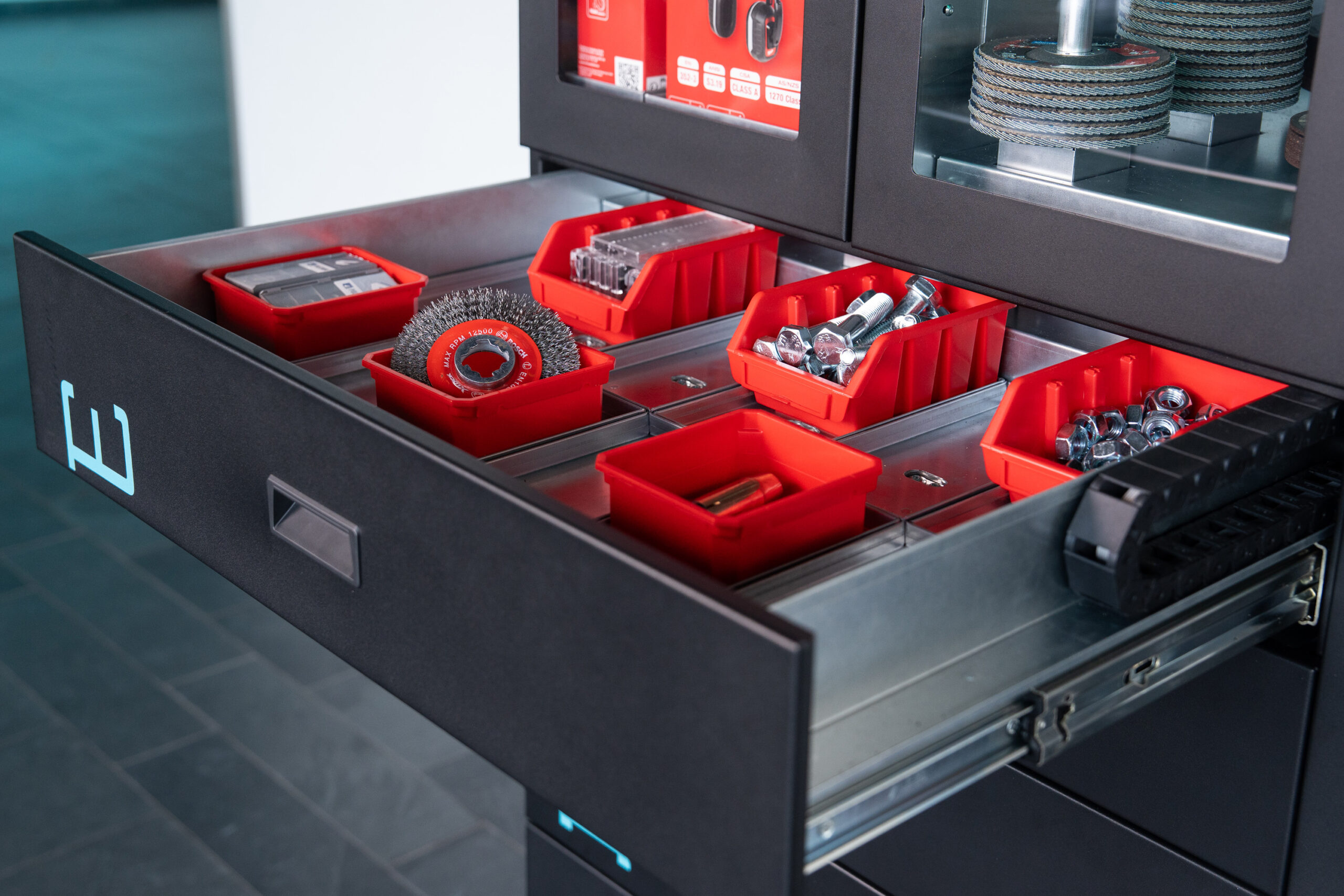 Modułowa architektura IRSCALE umożliwia łączenie szuflad i skrytek - w obu modułach instalowane sa wagi! Pozwala to obsłużyć asortyment o bardzo zróżnicowanych gabarytach - od drobnych komponentów po większe narzędzia. Konfiguracja dobierana jest do wymiarów i wagi produktów oraz do wymaganego poziomu kontroli.